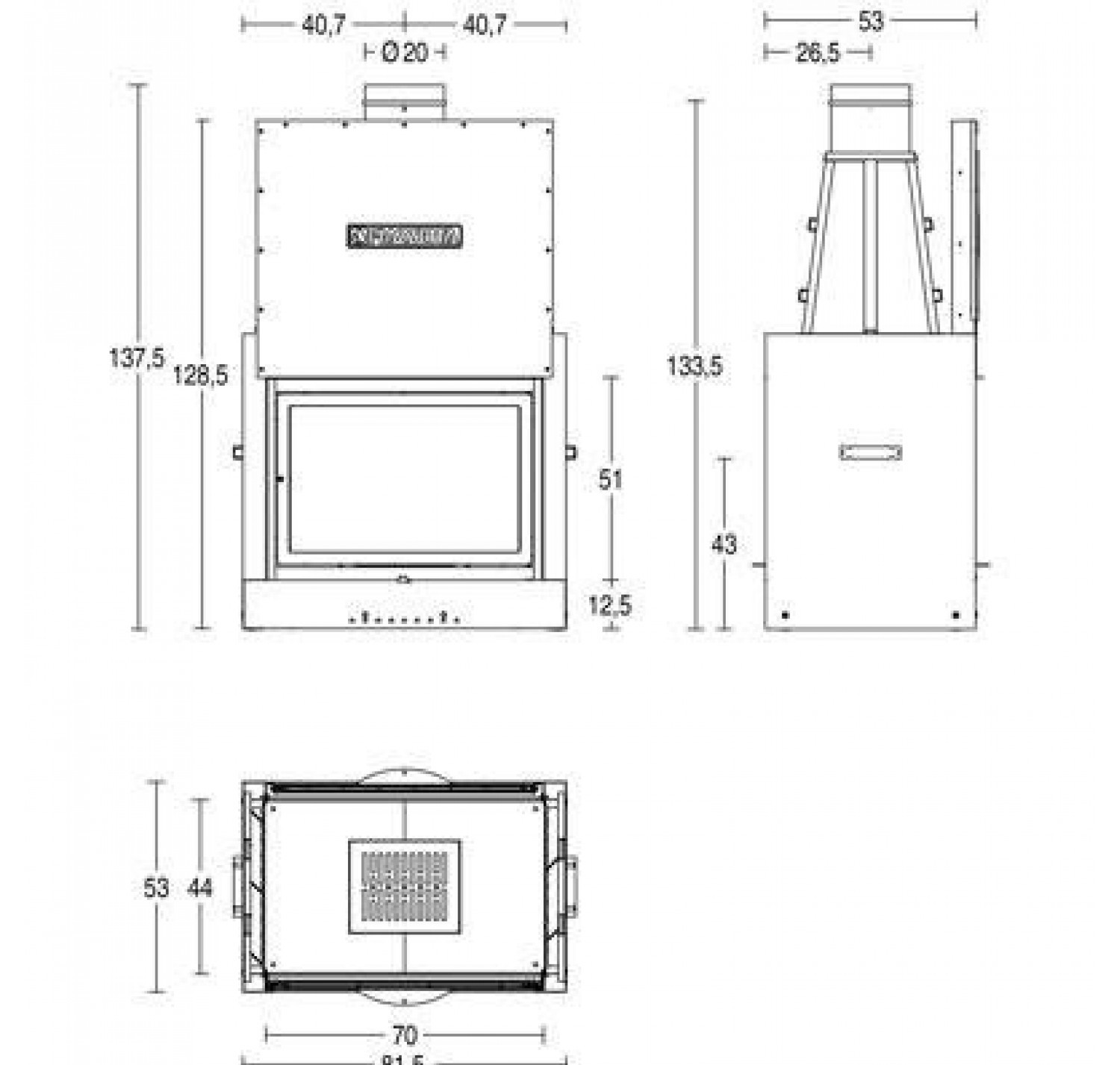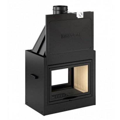 Топка имеет сквозное стекло. Подъемная дверца с жаропрочным стеклом, что позволяет наслаждаться открытым огнем, которая открывается на петлях для чистки. Стальной кожух и внутреннее основание из чугуна обеспечивают прочность и долговечность. Имеет современный дизайн.