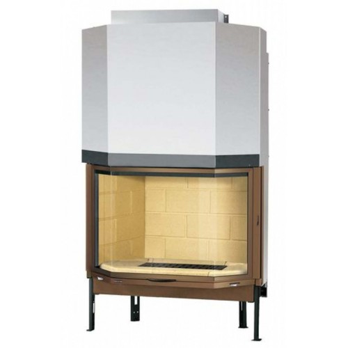 Призматическая топка, профиль стекла "confort", выполненная из толстостенной стали. Отделка очага кирпич. В качестве горючего используются дрова. Дверь открывается вверх. Увеличенный дымосборник.