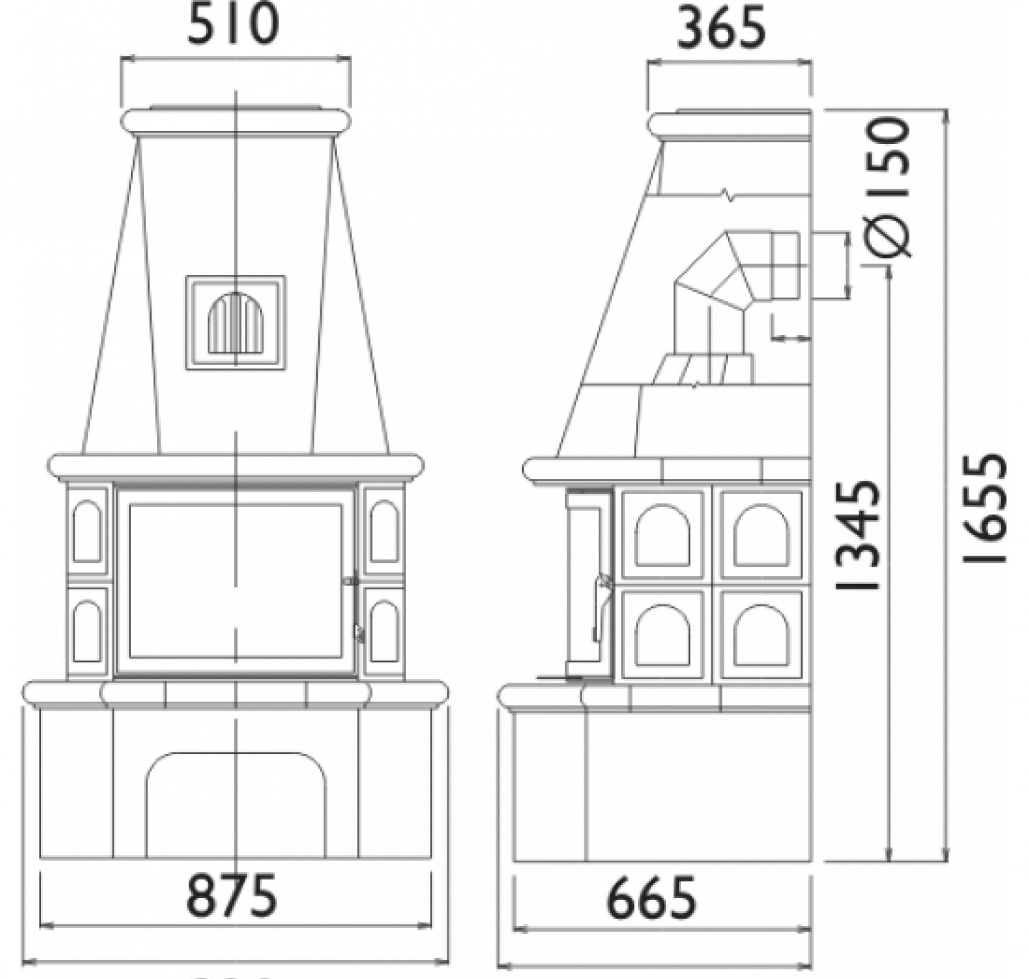 Трубы дымохода скрыты от глаз за сверху находящемся коробом, печь идет уже в комплекте с коробом.