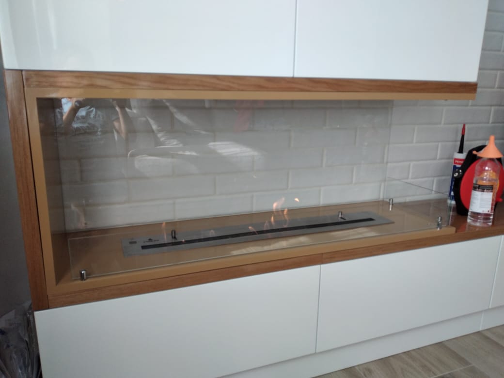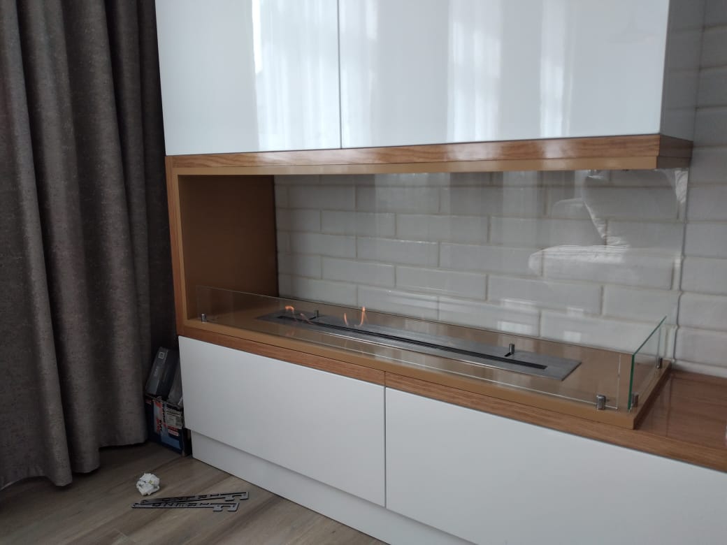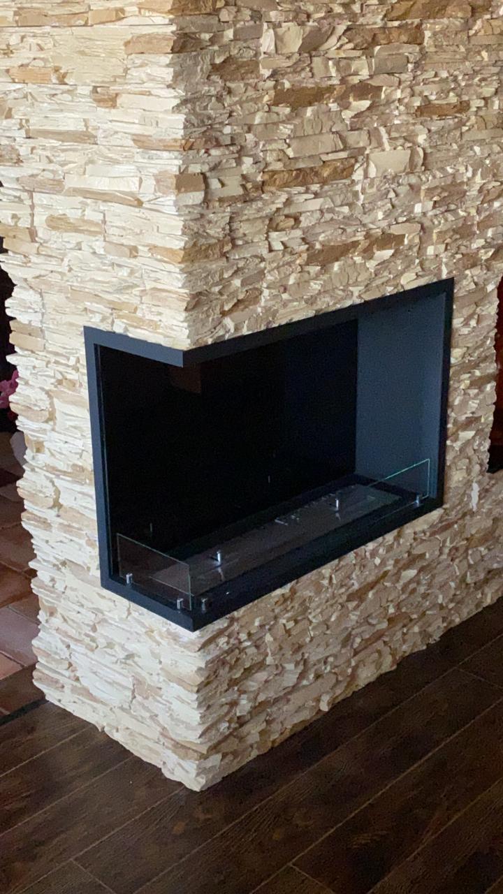 Биокамин Firezo langolo Sinistro размером 850х580х290. Топливный блок ШхВхГмм: 700х43х120 с линией огня 600мм. Выполнено по индивидуальному дизайну для клиента Максима из Реутова.